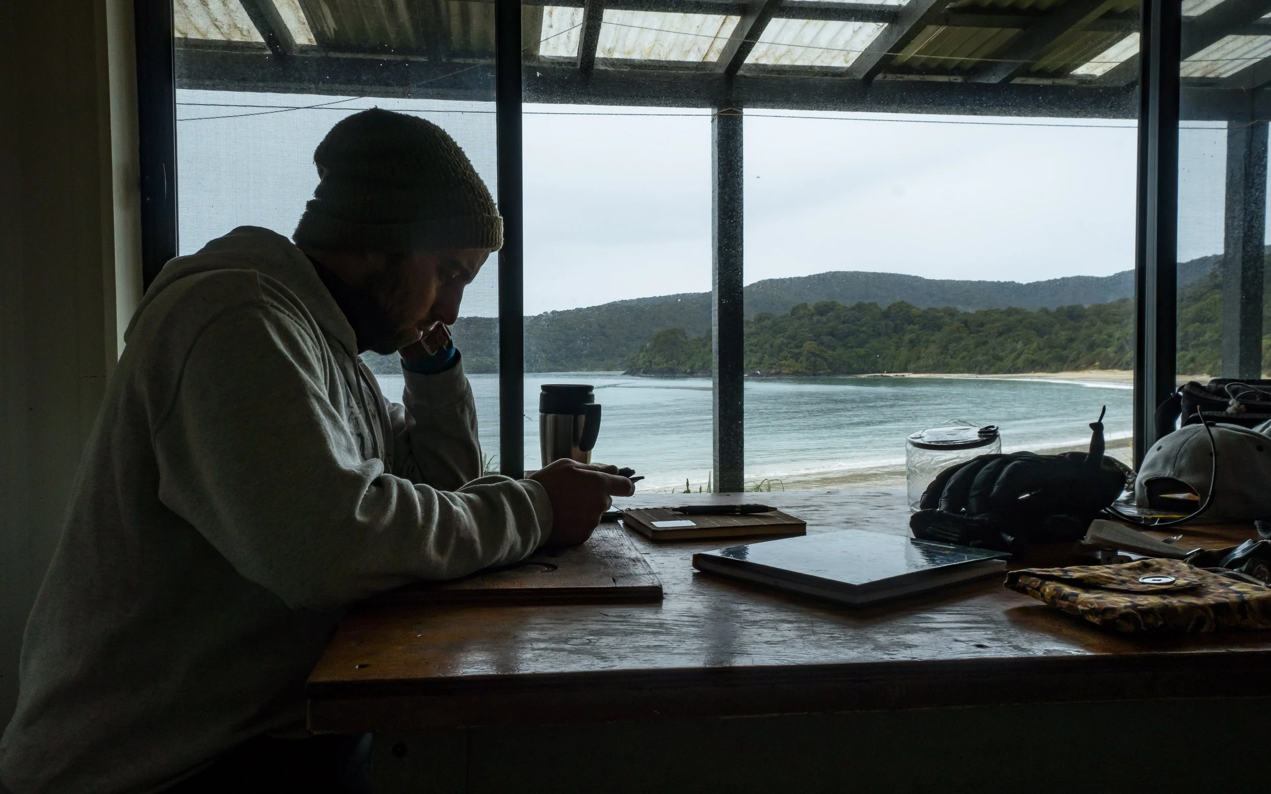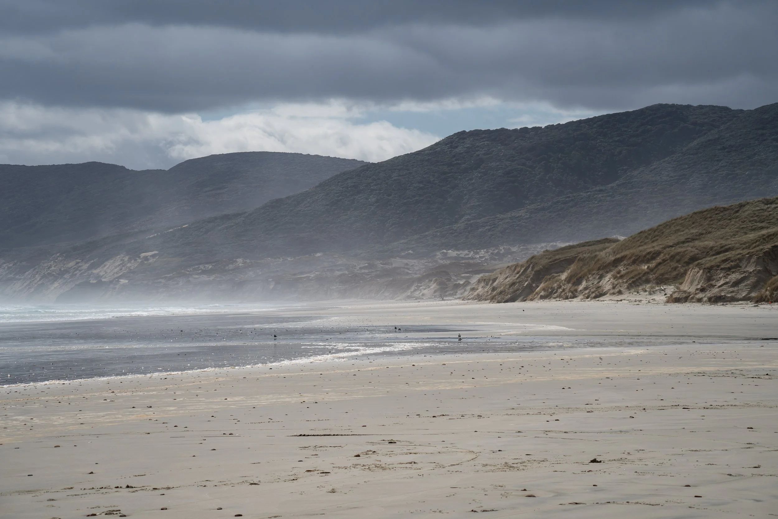 After a great stay at Bungaree we got up early the next day to see what the day had in store for us. We like to start walking early, preferably at 7am but it was raining heavily and we decided to wait it out a bit to see if it slowed down. After a few hours the rain slowed but never stopped, but we got going and made our way further north. This was the biggest day for us so far and in the rain it got extra slippery along the roots and we took extreme care as we made our way along the track. We came to Murray Beach which is a stunning long sandy beach, but in pouring rain, it was now anything but stunning. Heading into the wind we pushed on and eventually found shelter in a Hunters hut at the end of the beach. A great place for us to rejuvenate. After a long break here we felt ready to move on and walk the last hours to Christmas village hut (not a village). We arrived fairly late, only about an hour before sunset. We decided to stay here for 2 nights to make the walk up here more worth it as we weren't planning on walking any further along this track.